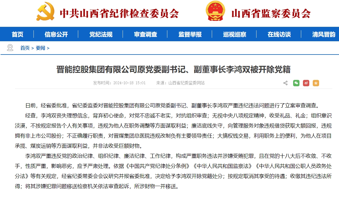 晉能控股集團有限公司原黨委副書記、副董事長李鴻雙被開除黨籍